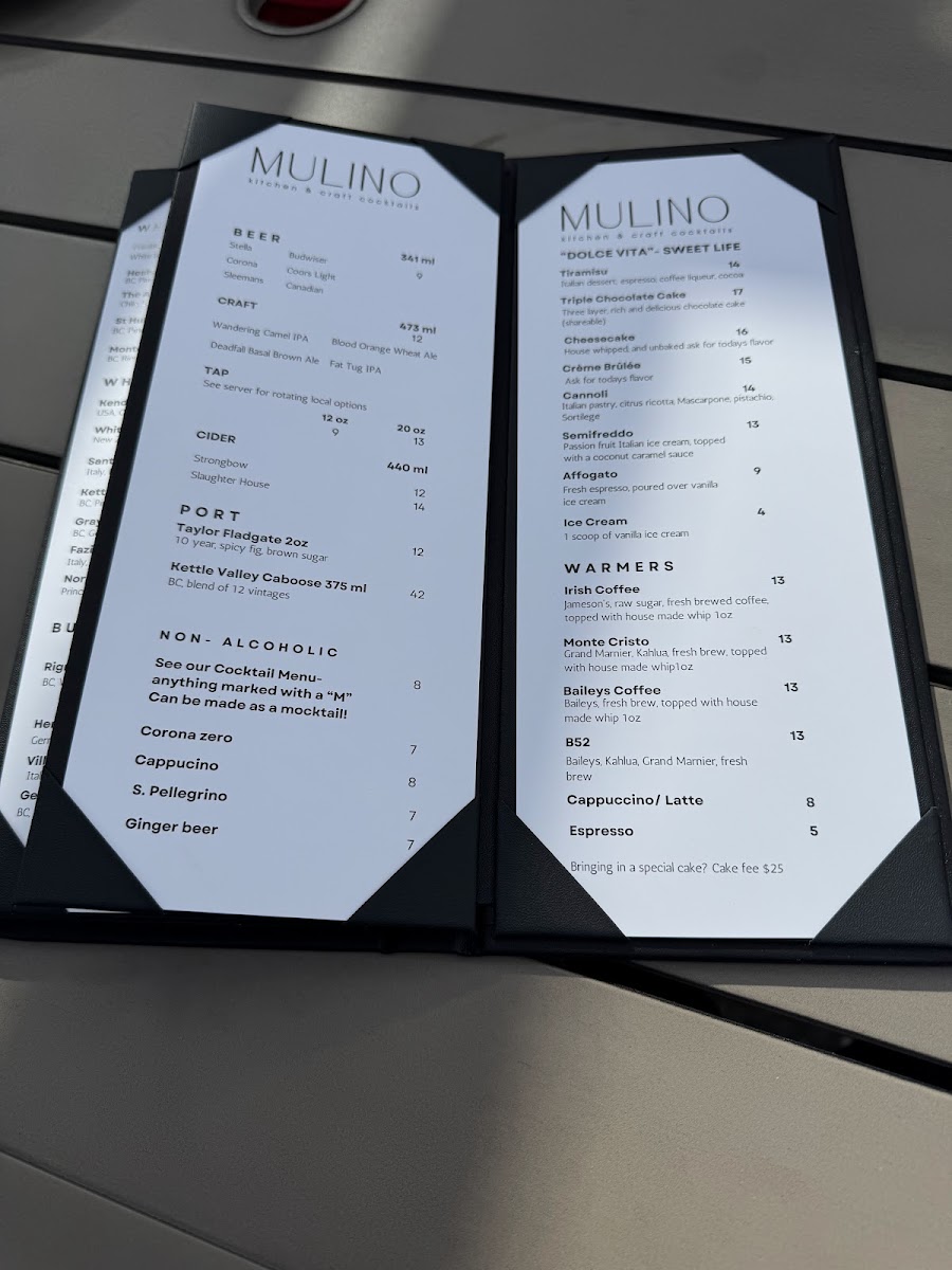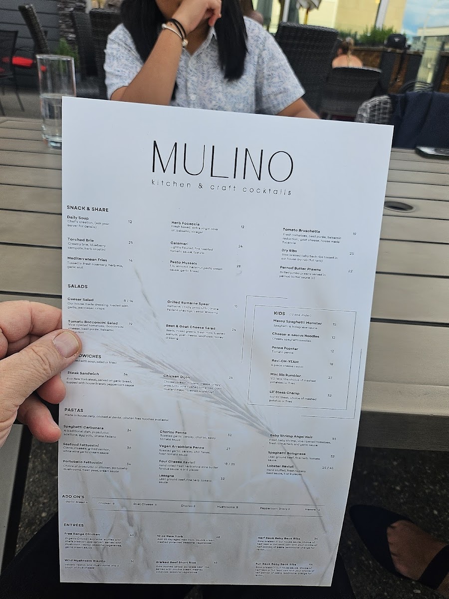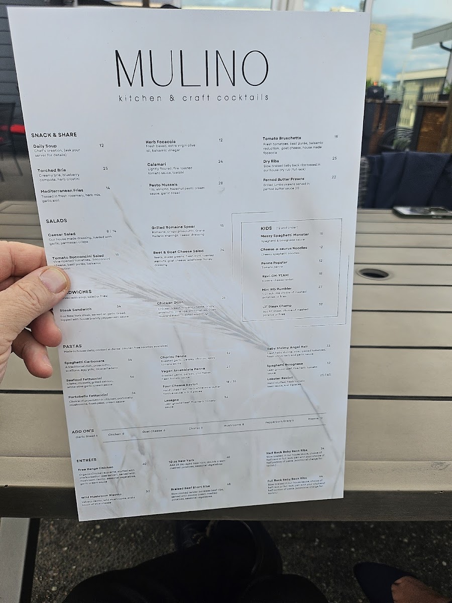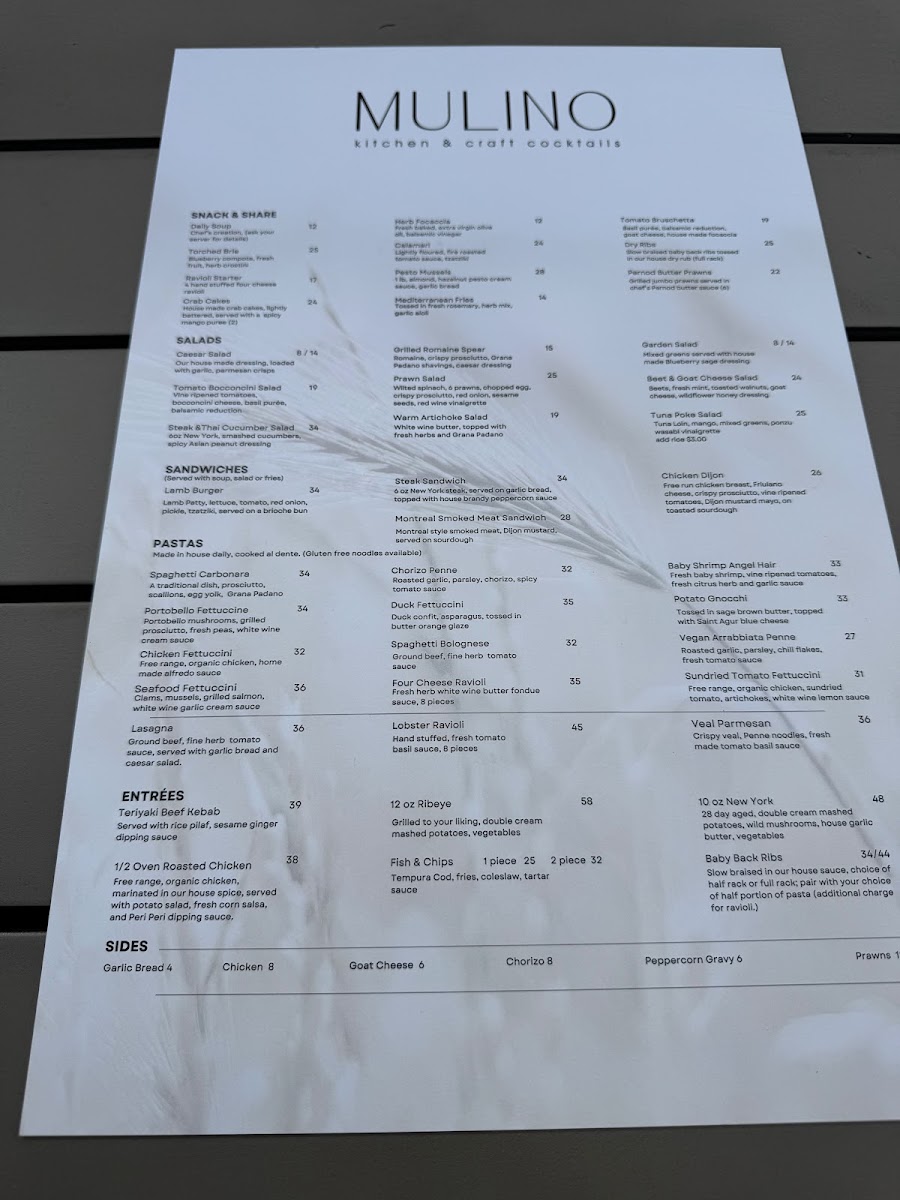 Mulino Kitchen & Craft Cocktails offers a well-rounded menu that features a variety of dishes to cater to different tastes. For those looking to share, the Daily Soup and Herb Focaccia are great choices, along with the Tomato Bruschetta, Calamari, and Dry Ribs. The salads are equally diverse, offering the classic Caesar Salad, the refreshing Grilled Romaine Spear, and unique options like the Prawn Salad and Beet & Goat Cheese Salad. Sandwich lovers can indulge in the Steak Sandwich, Chicken Dijon, or the hearty Lamb Burger, while the Montreal Smoked Meat Sandwich provides a satisfying, savory bite. Pasta options like the rich Spaghetti Carbonara, flavorful Chorizo Penne, and the delicate Baby Shrimp Angel Hair stand out, along with the earthy Portobello Fettuccine and luxurious Duck Fettuccine. For a more substantial meal, the Teriyaki Beef Kebab, 12 oz Ribeye, and 10 oz New York steaks deliver a robust dining experience, while the 1/2 Oven Roasted Chicken and crispy Fish & Chips provide comforting classics. The menu at Mulino is a wonderful mix of both familiar and inventive options, perfect for any dining occasion.