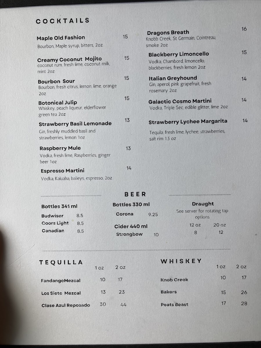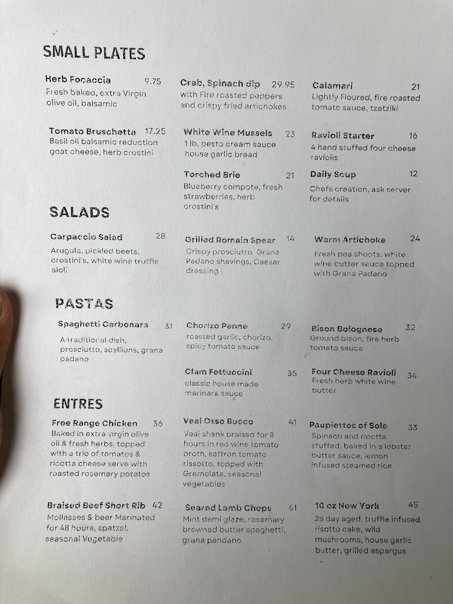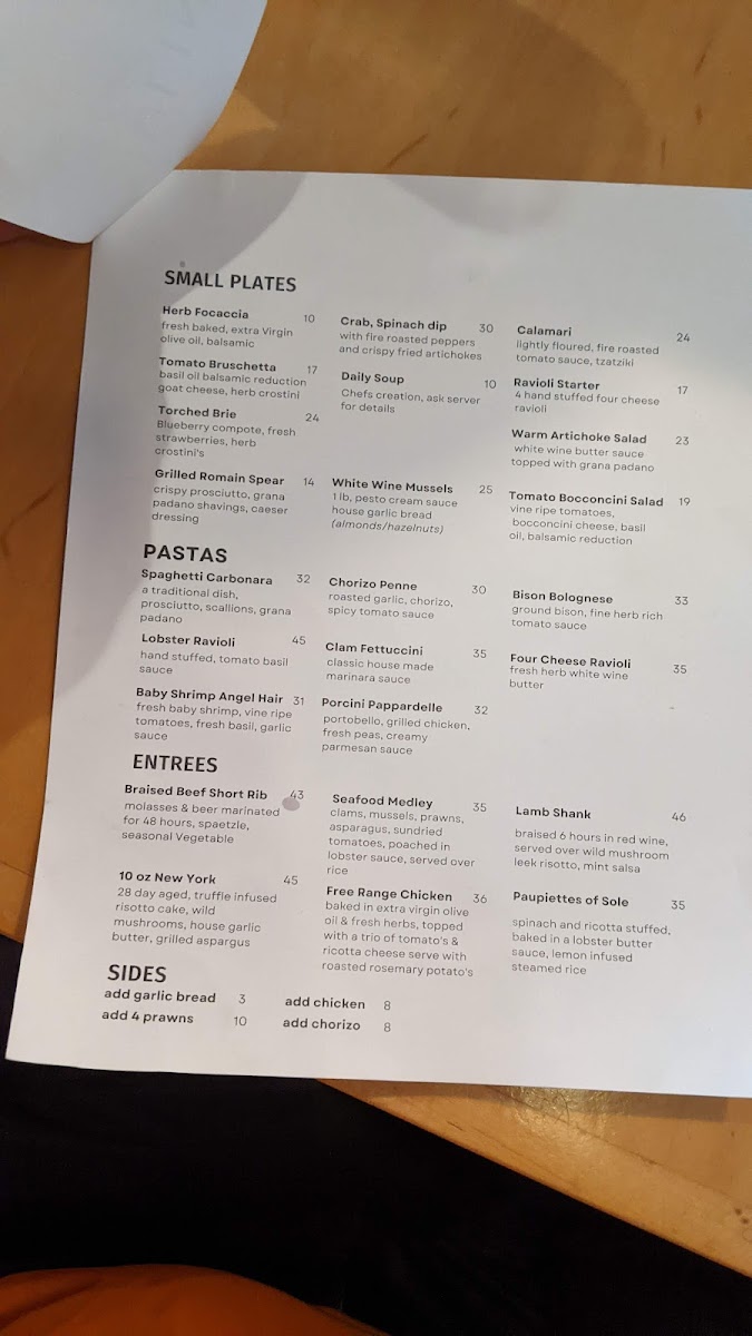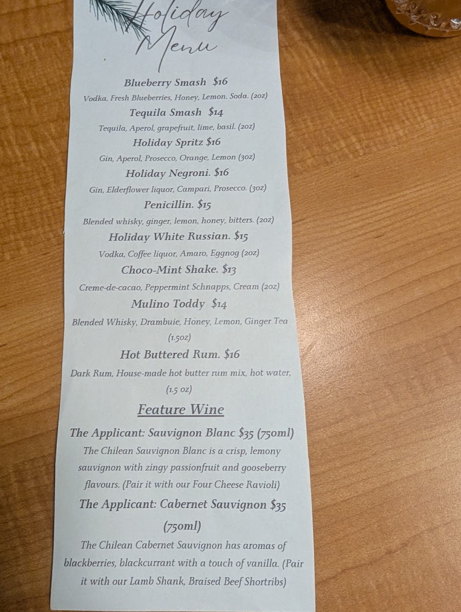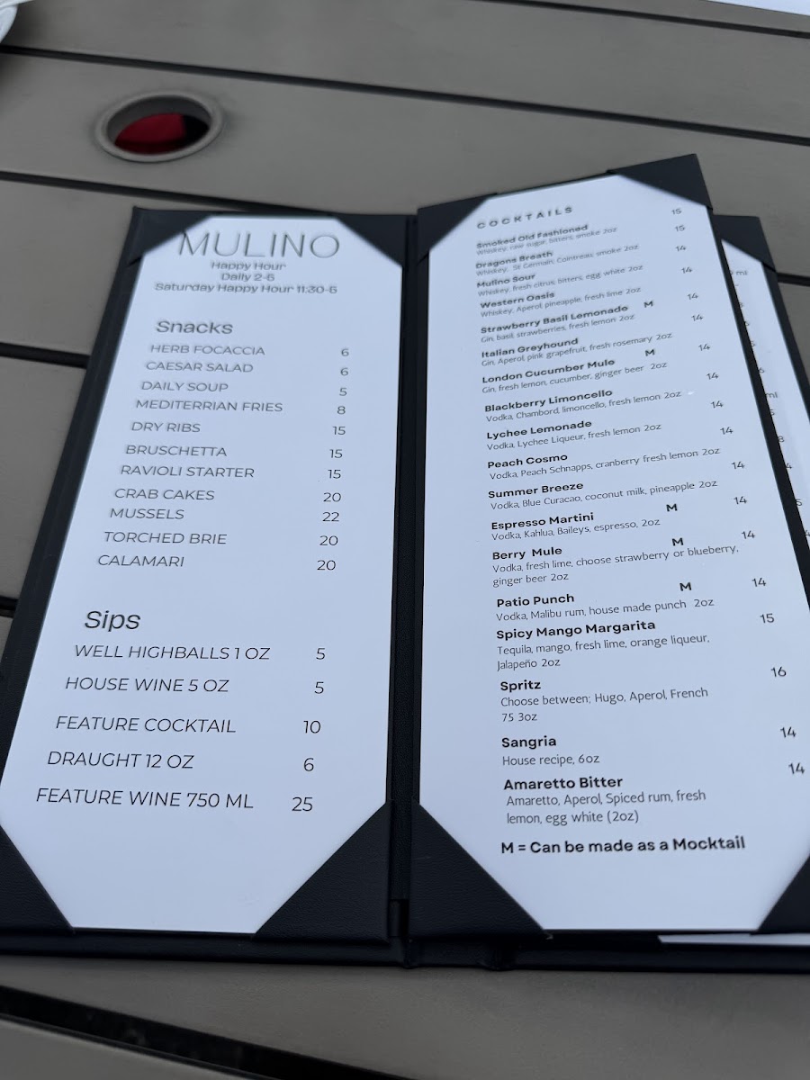 Mulino Kitchen & Craft Cocktails offers a well-rounded menu that features a variety of dishes to cater to different tastes. For those looking to share, the Daily Soup and Herb Focaccia are great choices, along with the Tomato Bruschetta, Calamari, and Dry Ribs. The salads are equally diverse, offering the classic Caesar Salad, the refreshing Grilled Romaine Spear, and unique options like the Prawn Salad and Beet & Goat Cheese Salad. Sandwich lovers can indulge in the Steak Sandwich, Chicken Dijon, or the hearty Lamb Burger, while the Montreal Smoked Meat Sandwich provides a satisfying, savory bite. Pasta options like the rich Spaghetti Carbonara, flavorful Chorizo Penne, and the delicate Baby Shrimp Angel Hair stand out, along with the earthy Portobello Fettuccine and luxurious Duck Fettuccine. For a more substantial meal, the Teriyaki Beef Kebab, 12 oz Ribeye, and 10 oz New York steaks deliver a robust dining experience, while the 1/2 Oven Roasted Chicken and crispy Fish & Chips provide comforting classics. The menu at Mulino is a wonderful mix of both familiar and inventive options, perfect for any dining occasion.